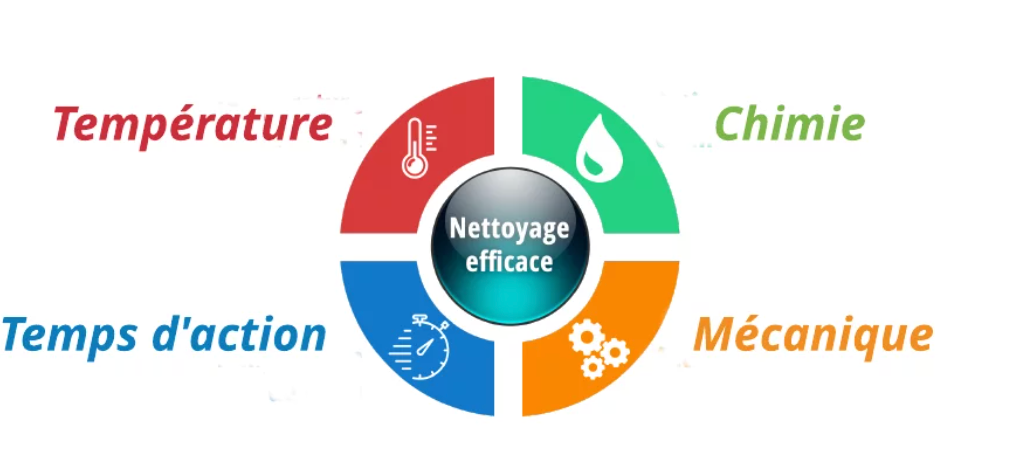 Le cercle de Sinner se compose de quatre éléments interdépendants : le temps, l'agitation, la température et la chimie. Ensemble, ces éléments influencent l'efficacité du nettoyage et doivent être équilibrés pour obtenir un nettoyage optimal.